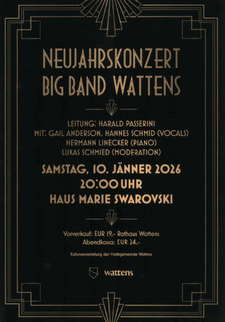 Die Big Band Wattens bestreitet das Neujahrskonzert unter der Leitung von Harald Passerini gemeinsam mit den special guests Gail Anderson und Hannes Schmid, vocals sowie Hermann Linecker, piano. Moderation: Bürgermeister Lukas Schmied. Freuen Sie sich auf einen schwungvollen Abend mit mitreißender Musik! Karten gibt es ab Dezember im Museum Wattens.