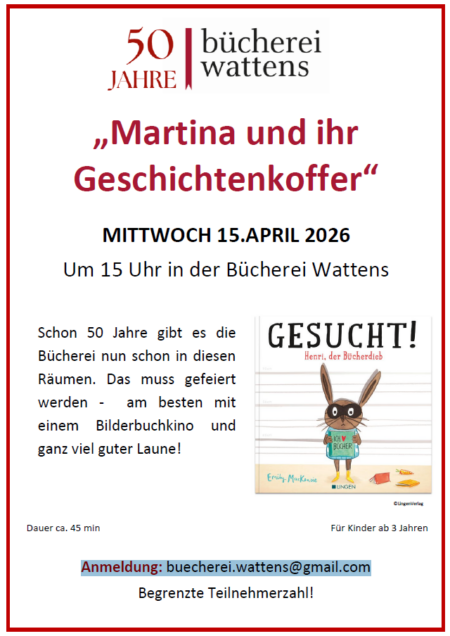 Schon 50 Jahre gibt es die Bücherei nun schon in diesen Räumen. Das muss gefeiert werden - am besten mit einem Bilderbuchkino und ganz viel guter Laune Für Kinder ab 3 Jahren, Dauer ca. 45 Minuten Anmeldung: buecherei.wattens@gmail.com, begrenzte Teilnehmerzahl